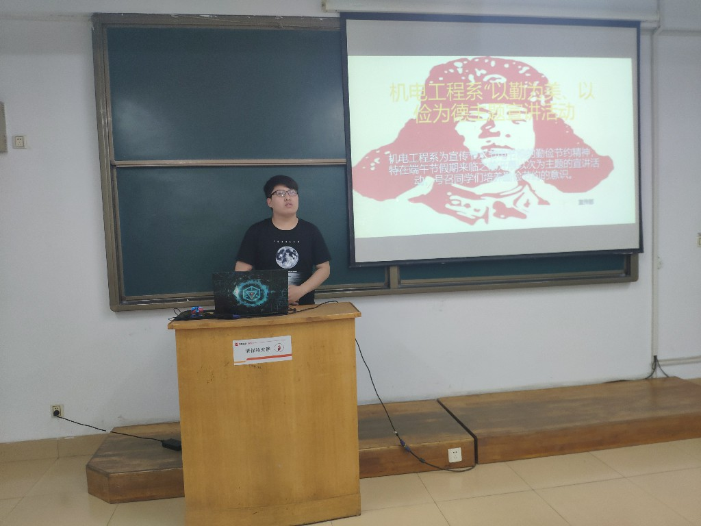 为深入贯彻落实中央关于“厉行勤俭节约,反对铺张浪费”的精神以及教育部《关于勤俭节约办教育 建设节约型校园的通知》要求,促使广老员工树立勤俭节约意识,养成勤俭节约习惯,机电工程系在2019年6月5日晚自习,于科技楼409由宣传部举办了以“以勤为美、以俭为德”为主题的宣讲会。