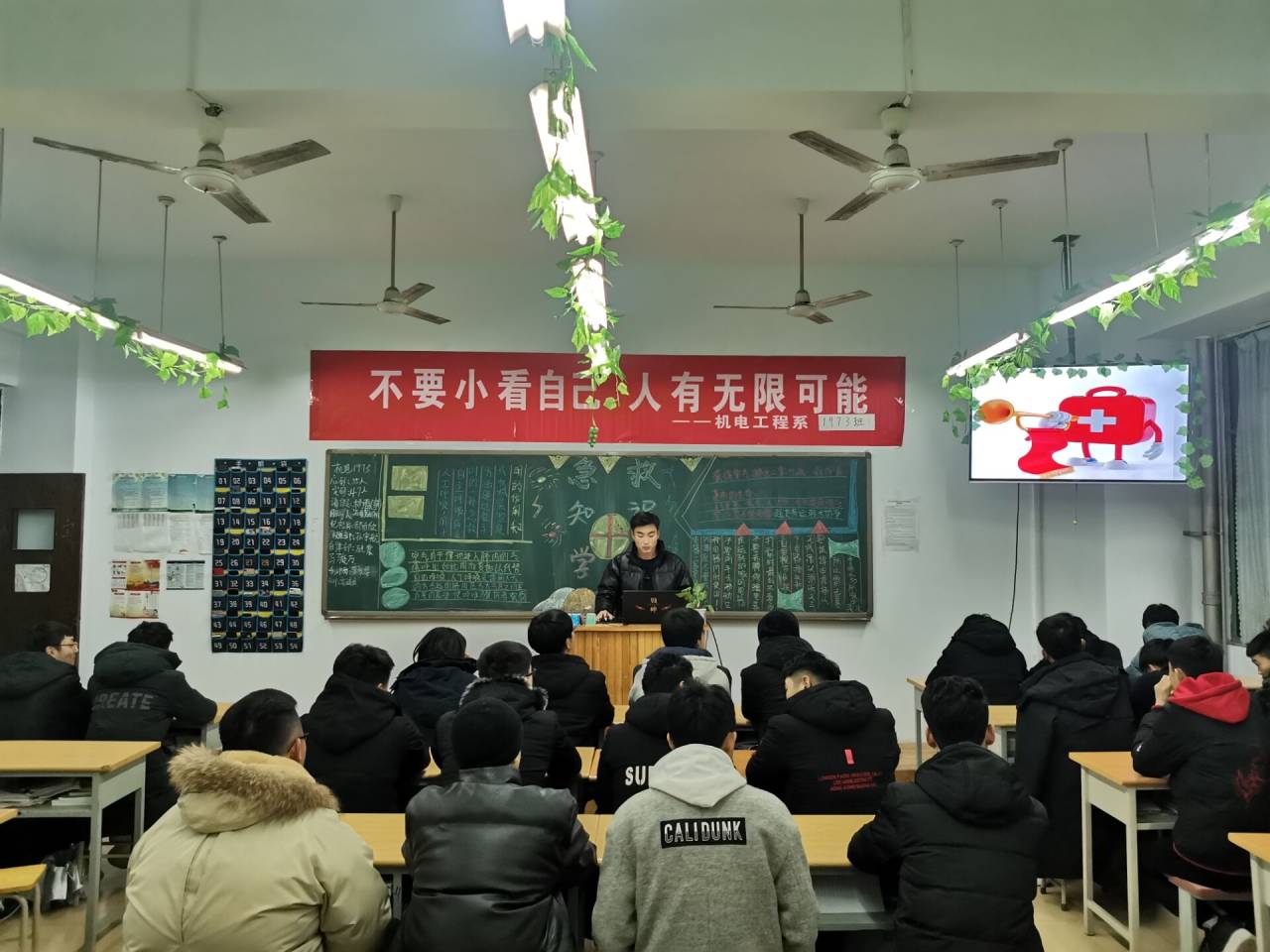 在日常校园生活中,磕磕绊绊总是在所难免。面对突发情况,如果及时而正确的应急措施是非常必要的。为了让同学们学习急救安全知识,机电工程系于2019年12月25日在科技楼对大一大二全体同学开展“急救知识学习”为主题教育安全班会。