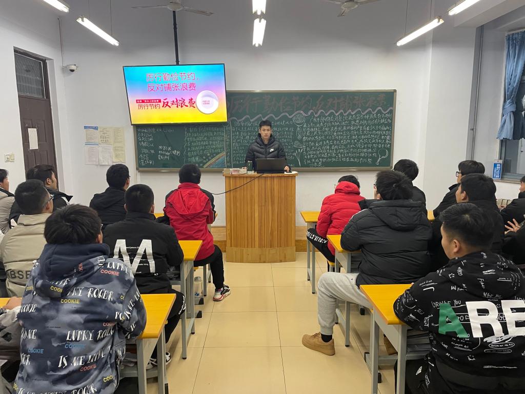 为了让同学们更好的勤俭节约,杜绝浪费。伟德国际victor1946于2021年11月9日晚上在科技楼三、四、五楼开展了以《厉行勤俭节约,反对铺张浪费》为主题的团
