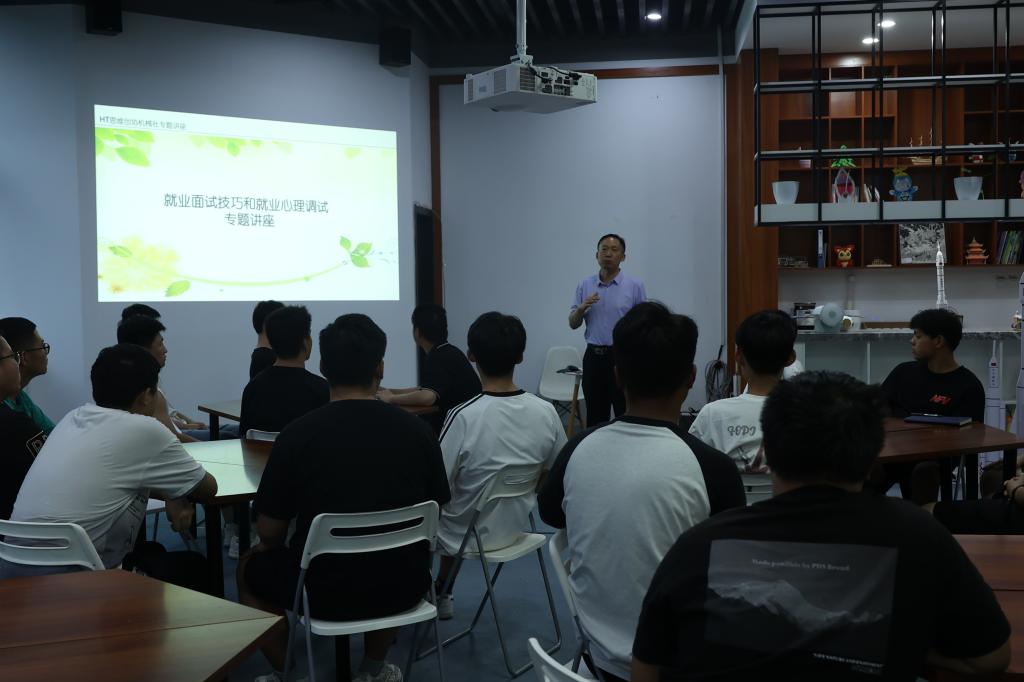 6 月 20 日晚,HT 思维创协机械社在实训楼文创中心开展“就业面试技巧和就业心理调试”专题讲座,讲座由社团指导教师魏安庆老师和裴娟老师主讲,22 级全体社员参加了此次讲座,。