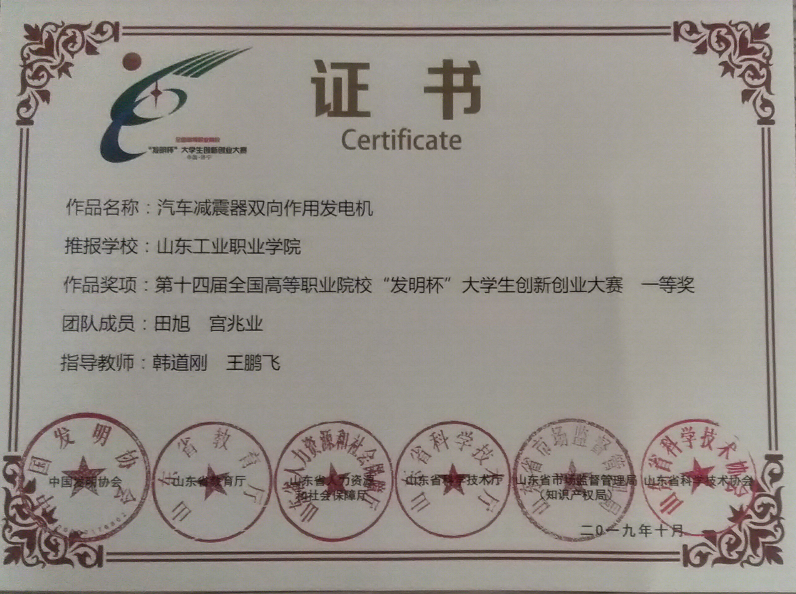 本次我系作品“汽车减震器双向作用发电机”荣获发明制作类一等奖、“全自动一体化营救机器人”荣获发明制作类三等奖。“汽车减震器双向作用发电机”可以对回汽车减震器进行能量回收,为汽车提供更长的续航能力,具有较强的实用性和研究前景。