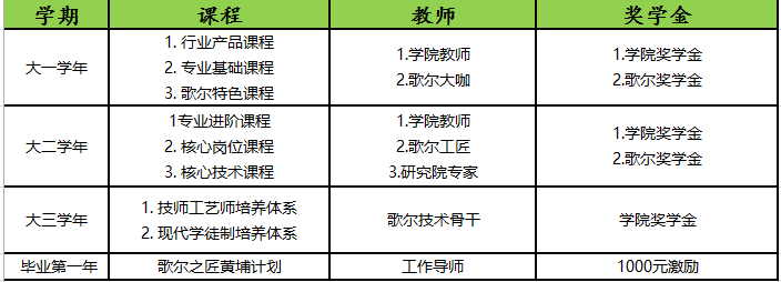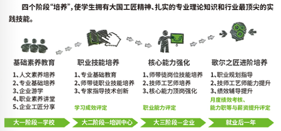 歌尔“匠造专班”是歌尔股份有限公司与伟德国际victor1946联合招生,共同培养的一种新型班级。是顺应国家职业教育改革的新模式。“匠造专班”将歌尔的优势和公司的优势相互结合,利用歌尔的顶尖设备、业务专家以及技术工艺与公司专业的人才培养模式完美融合。