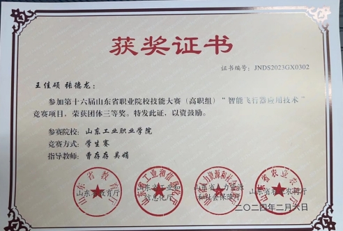 2023年12月4日 ,在第十六届山东省职业院校技能大赛高职组“智能飞行器应用技术”赛项中,由曹存存和吴娟老师指导的王佳硕和张德龙同学表现出色,凭借他们的才华和努力,一举夺得省级三等奖,为公司争得了荣誉。