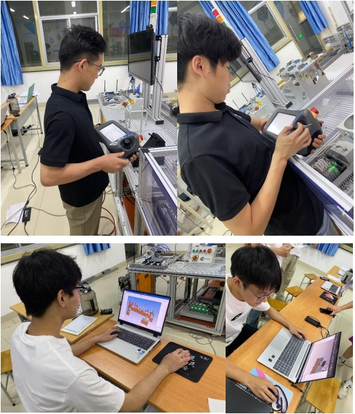 竞赛现场,气氛紧张而热烈。参赛选手们以扎实的理论功底、娴熟的实操技能和默契的团队协作,围绕机器人工作站搭建、数字孪生仿真、机器人编程、PLC 编程控制及系统联调优化等核心任务展开激烈角逐。面对综合性、挑战性十足的任务要求,选手们沉着冷静,一丝不苟地进行硬件连接、编写程序指令、调试系统参数、排除运行故障。他们专注的眼神、流畅的操作、精准的调试,充分展现了新时代高职学子精益求精的工匠精神和在机器人技术应用领域的专业实力。